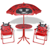 Ez a kerti szett egy asztalt, két széket, egy napernyőt tartalmaz melyet kifejezetten a gyerekeknek terveztek ahol jól érezhetik magukat, a kertben vagy a teraszon. A nagy teherbírású acél váz, az erős és robusztus kerti garnitúra lehetővé teszi a biztonságos ülősarkokat a gyerekeknek. A mellékelt esernyő megvédi az Ön kisgyerekét a naptól. A széket össze lehet hajtani amikor nincs használatban. A szállítmány 1 asztalt, 1 napernyőt és 2 széket tartalmaz. Nagyon k