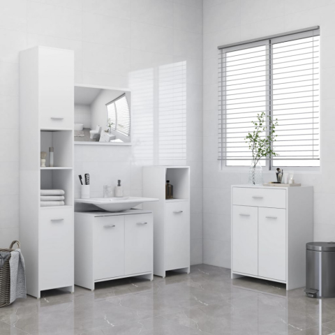 Ezzel a rendezett és lenyűgöző megjelenésű, 4 részes fürdőszobai bútorszettel további tárolóhelyet alakíthat ki fürdőszobájában. A letisztult vonalak és az elegáns dizájn tökéletesen beleolvad otthonába. Ez a készlet tartalmaz egy fürdőszobai szekrényt, egy mosdószekrényt, egy alacsony szekrényt és egy magas szekrényt. Ezek a szekrények különféle tárolási lehetőségeket kínálnak, és extra helyet biztosítanak a fürdőszobában tárolható tárgyak szá