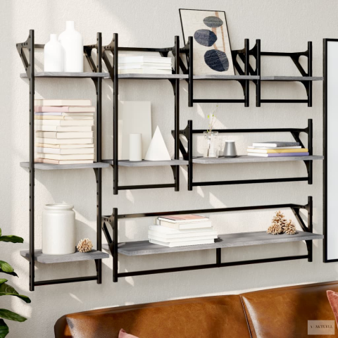 1 kép vidaXL 6 részes szürke sonoma színű szerelt fa falipolcszett rúddal
