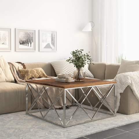 Teljes vidaXL ezüstszínű rozsdamentes acél és tömör talpfa dohányzóasztal termékleírás
