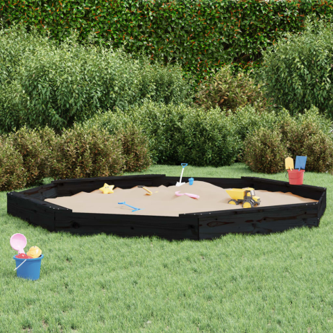 vidaXL Fekete nyolcszög alakú tömör fenyőfa homokozó ülésekkel