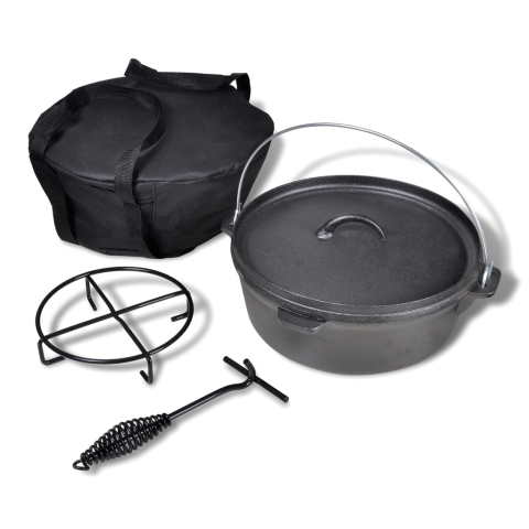 Ez a Holland sütő, aminek a kapacitása 5,6 L, ideális modell a kezdőknek és a profiknak egyaránt. A Holland sütő használható ragunak, pörkölteknek és sülteknek, stb.A Holland sütő egy hordozó táskával van szállítva, egy peremes fedéllel, egy fedő emelővel és egy állvánnyal. Kiváló minőségű anyagokból van gyártva, ez a Holland sütő nagyon tartós. A fekete hordozó táska tisztán tartja a szállítás során.Ez a Holland sütő egy sokoldalú eszköz otthoni