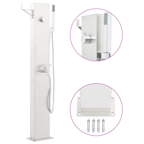 Modern zuhanycsaptelepünk nagyszerű kiegészítője lesz úszómedencéjének vagy más kültéri környezetének. A kerti csaptelep strapabíró, szálcsiszolt rozsdamentes acélból készült, így időjárásálló. Csapteleppel és kézi zuhanyfejjel rendelkezik, amelyekkel kielégítheti kertészkedési, öntözési és gyors zuhanyzási igényeit. Konzollal is rendelkezik, így a gégecsövet könnyen fel tudja akasztani. A zuhanycsaptelepet könnyű összeszerelni. A mellékelt szerelé