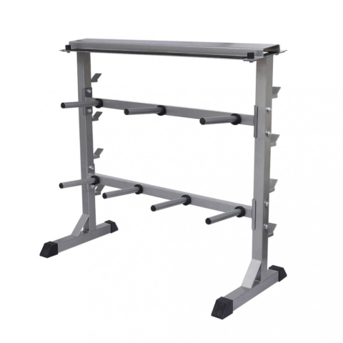 Kialakítása miatt alkalmas szabad súlyok, csoportos súlyok és súlyzók, valamint a padlóról felemelhető súlyzók számára. A legtöbb mértetű és jellegű súlyzó számára alkalmas, beleértve a neoprént és az öntöttvasat is. A stabil váz és a két polc segít fennt