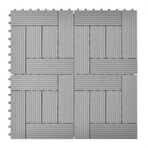Ez a WPC deszkázat csempe készlet egyedi méretű 30 x 30 cm, és 11 darabot tartalmaz, lefedő felülete 1 négyzetméter. Ez tökéletes teraszokra erkélyekre, fürdőszobák, medencék és fürdő részek területén.Ez a kiváló minőségű WPC csempe gyors csatlakozó rendszerrel rendelkezik, amely lehetővé teszi, hogy könnyen és gyorsan össze lehessen illeszteni ezeket szerszámok nélkül. Készült minőségi fa-műanyag összetételből, a lapok vízállóak és nagyon tartósa