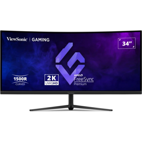 Monitor - VA, ívelt, Ultra Wide QHD, 3440 × 1440 (21:9), 180 Hz, matt kijelző, 8 bit, 1 ms, FreeSync, állítható magasság, HDR, hangszórók, HDMI és DisplayPort, VESA Merülj el kedvenc játékaid világában minőségi Ultra Wide QHD (3440 × 1440) felbontásban a kiváló 34" ViewSonic LCD hajlított monitorral! A sima kép érdekében VA panelt kínál 180 Hz képfrissítési gyako
