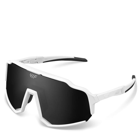 Kerékpáros szemüveg - uniszex, sötétedő, polarizációs, nem párásodó és törésgátló, fekete üveg, fényáteresztő képesség S3, lencsék anyaga polikarbonát , panoráma látómező, rugalmas keret, csúszásgátló és lágyított szárak, keretes konstrukció, fehér színű keret, puha híd a csomag része, UV400, UVA és UVB UV védelem, lencse mérete 6,5 × 14 cm (Ma×Sz), orrtámasz hossza 16,5 cm, tömege 30 g A VIF Two #AceOfShades napszemüveg kiemelkedik könnyűség