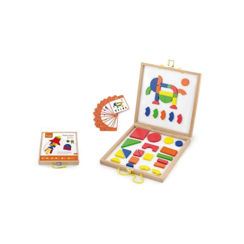 Koffer mágnesos kockákkal Viga. A fából készült koffer tartalma 42 kocka és 12 kártya 24 kombinációval, amelyekbe a kockákat lehet elhelyezni. Kiváló minőségi anyagokból készült. A mágneses és színes kockák különböző formájúak. A játék festett fa. Kiemelt