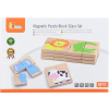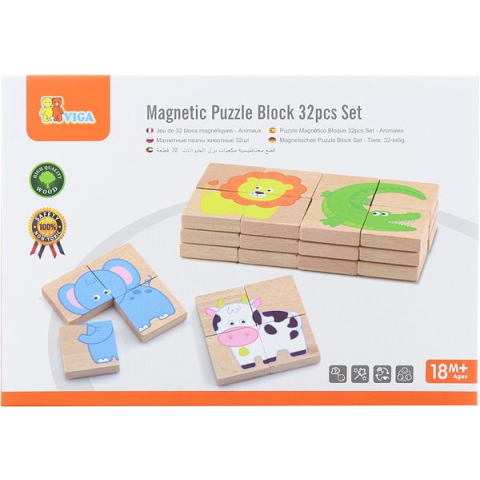 Fa puzzle - alkalmas 1,5 éves kortól, 32 darabos, mágneses, állatok motívum A puzzle összesen 32 fa elemből áll, amelyekből különböző állatfigurákat lehet összerakni. Az egyes darabok lekerekített élekkel rendelkeznek a kisgyermekek biztonságos játékához. A fa puzzle összerak