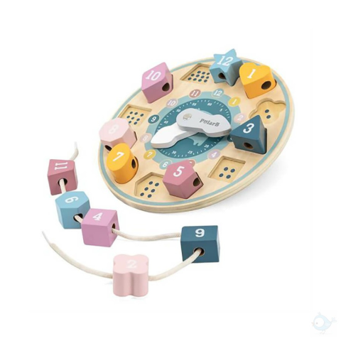 Szeretnénk bemutatni Önnek egy fából készült játékot a VIGA-tól - az órát a PolarB sorozatból. Az óralap formájú játék 2 mozgatható mutatóval, 12 geometriai blokkkal és egy zsinórral rendelkezik. Minden blokknak van egy lyuk is, amelyen keresztül gyöngyök