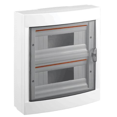 Lakáselosztó falon kívüli szereléshez, 24 modulhoz. Sorok száma: 2 A kiselosztó dobozok új építésű vagy renoválandó épületekben kerülnek felszerelésre. Olyan moduláris kivitelű doboz, amelyben a lakásban kiépített áramkörök védelmére szolgáló készülékek m