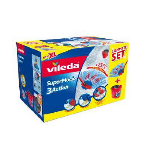 A Vileda SuperMocio 3 Action szett könnyű és hatékony tisztítást kínál a padlójának, amely szett tartalmaz egy gyorsfelmosó rongyot és egy Power Press technológiával rendelkező Supermop vödröt is. Hála a Supermop vödörnek nem szükséges többé lehajolnia a vödörhöz és kézzel kicsavarnia a felmosórongyot. A vödör csavarókosár részén található fogak minden irányból körbefogják a rongyot, így pont csak annyi víz marad a felmosórongyban, amennyi a higiénikusan tiszta padló eléréséhez szükséges. A rendkívül hatékony mikroszálas felmosó 3D, velúr flock szálakkal rendelkezik, amit az Egyesült Államokban fejlesztettek ki és szabadalmaztatták, 40%-kal nagyobb hatékonysággal tisztít, mint a hagyományos felmosórongyok. A felmosó nyél ergonomikus és így elősegíti a nehezen megközelíthető helyek elérését is a felmosóronggyal.