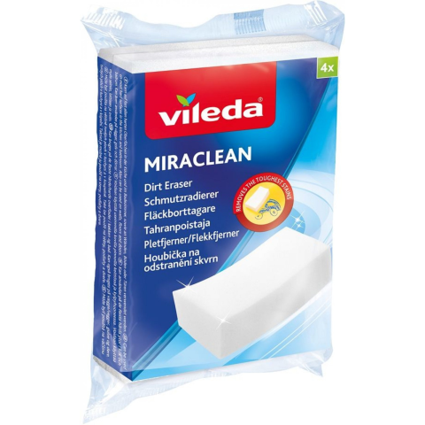 A Vileda Miraclean folteltávolító csodaszivacs könnyen megtisztítja a konyhában és a fürdőszobában a kemény felületeket a makacs szennyeződésektől, mint tea, kávé, vízkő, zsírkréta vagy toll. Használható falakon, padlón és ajtókon is. Használati utasítás: Nedvesítse be a Vileda Miraclean csodaszivacsot és nyomkodja ki belőle a felesleges vizet. Gyengéden dörzsölje meg a foltot a szivaccsal. Összetétel: 100% melamin. Figyelem: Először egy kevésbé feltűn