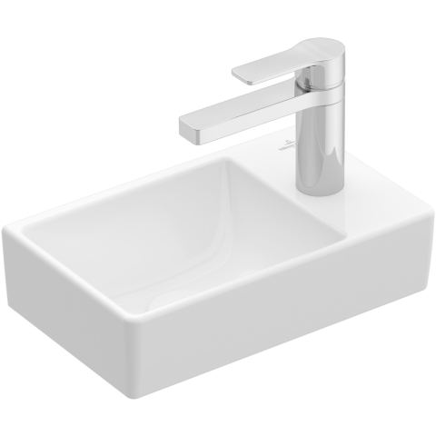 Falra szerelhető, mosdó a bal oldalon, Hozzáillő bútorprogram: Avento Figyelem: a túlfolyó nélküli mosdókat elzáratlan leeresztő szeleppel kell használni! Villeroy & Boch Avento Kézmosó 360 mm balos kivitel – Praktikus megoldás kis terekbe A Villeroy
