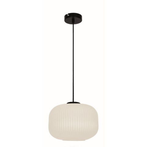 Függesztett lámpa fehér üveg búrával és fekete szerelvényekkel. Letisztult és modern kialakítása elegáns megvilágítást biztosít bármely térben...