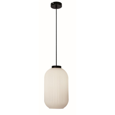Függesztett lámpa fehér üveg búrával és fekete szerelvényekkel. Letisztult és modern kialakítása elegáns megvilágítást biztosít bármely térben...