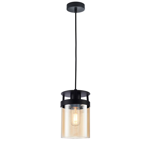 Függesztett lámpa, borostyán színű üvegbúrával és fekete fém szerelvényekkel. E27-es fényforrással kompatibilis, melyet a csomagolás nem tartalmaz...