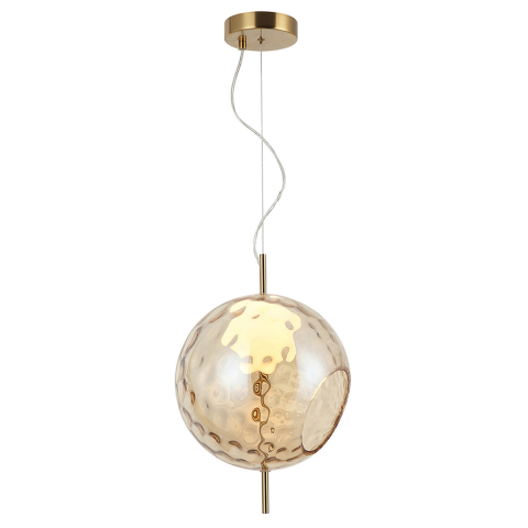 Függesztett LED lámpa matt arany fém szerkezettel, pezsgő árnyalatú üvegbúrával. Az üvegbúrákat finom, kör alakú bemélyedések díszítik, amelyek különleges textúrát és egyedi fényjátékot hoznak létre, elegáns megjelenést kölcsönözve a lámpának...