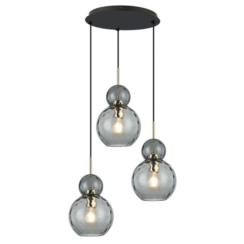 LED függesztett lámpa 3 db füstszínű üveg búrával, arany fém részekkel és fekete szerelvénnyel. Elegáns kialakítása egyedi megvilágítást biztosít, tökéletes választás stílusos enteriőrökhöz...