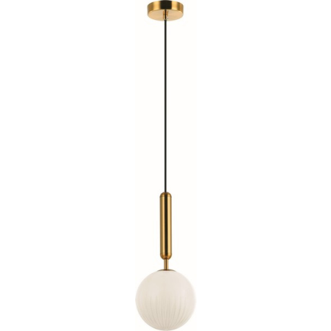 Függesztett lámpa opál fehér, fényes és gravírozott üvegbúrával, arany matt szerelvényekkel. Elegáns és letisztult dizájn, amely tökéletes kiegészítője lehet modern vagy klasszikus stílusú tereknek...
