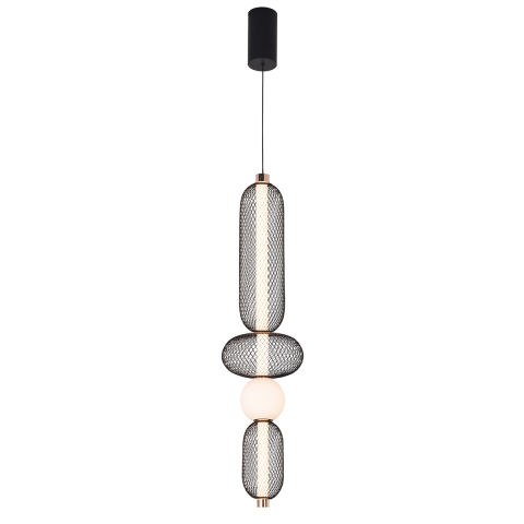 Függesztett LED lámpa arany színű lámpatesttel és fekete, rácsos kialakítású lámpabúrával. Egyedi megjelenése modern stílusú terek tökéletes kiegészítője lehet...