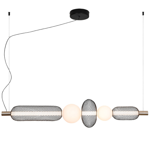 Függesztett LED lámpa arany színű lámpatesttel és fekete, rácsos kialakítású lámpabúrával. Egyedi megjelenése modern stílusú terek tökéletes kiegészítője lehet...