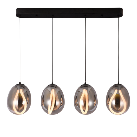 Modern stílusú, függesztet lámpa fekete fém kivitelben, négy füstszínű üveg búrával. Meleg fehér fényű, beépített LED fényforrást tartalmaz (amely nem cserélhető), így kényelmes és tartós világítást biztosít...