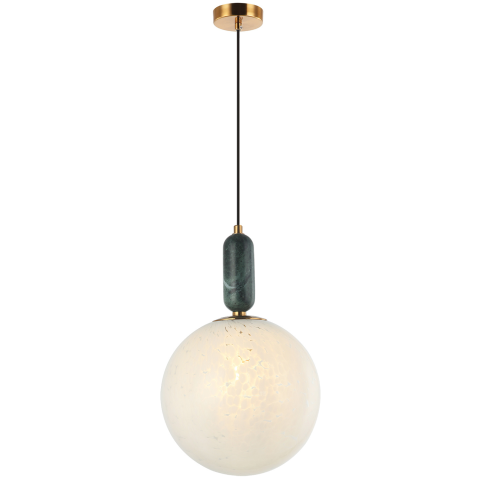 Függesztett lámpa optikai fehér üveg búrával, amely márvány mintázatú, oxidált fém szerelvényekkel. Stílusos és egyedi megjelenésével bármely helység figyelemreméltó darabja lehet...