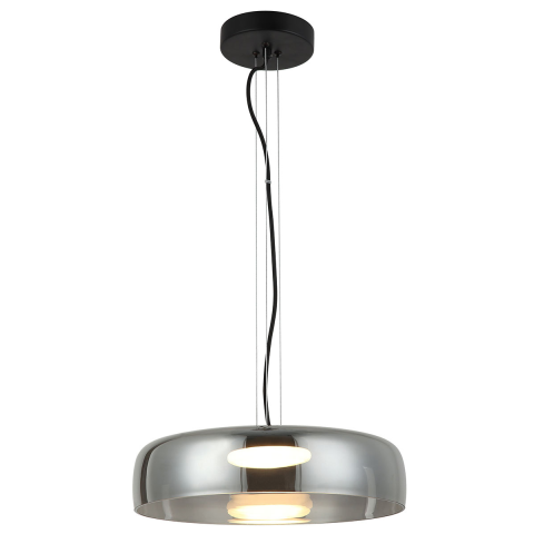Függesztett LED lámpa fekete fém szerkezettel, füstszínű árnyalatú üvegbúrával. 3000 K színhőmérsékletű meleg fehér fénye hangulatos megvilágítást biztosít modern és elegáns terekben...