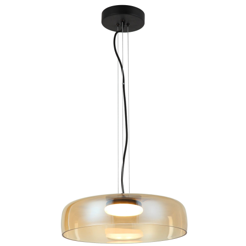 Függesztett LED lámpa fekete fém szerkezettel, pezsgő színű árnyalatú üvegbúrával. 3000 K színhőmérsékletű meleg fehér fénye hangulatos megvilágítást biztosít modern és elegáns terekben...