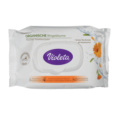 A Violeta 60 darabos, extra puha, nedves toalettpapírt a család legérzékenyebb bőrű tagjainak is bátran ajánljuk. Műanyag mentes, biológiailag lebomló anyagból készült. A visszazárható kupakos termék lehúzható a toaletten. Bio körömvirág és zöldtea ki