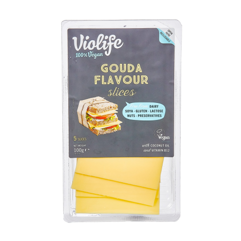 Violife növényi készítmény szeletelt gouda 100 g Összetevők: víz, kókuszolaj (23%), módosított keményítő, keményítő, tengeri só, aromák, olívakivonat, színezék (béta-karotin), B12-vitamin. Nem tartalmaz tejterméket, szóját, glutént, laktózt, dióféléke