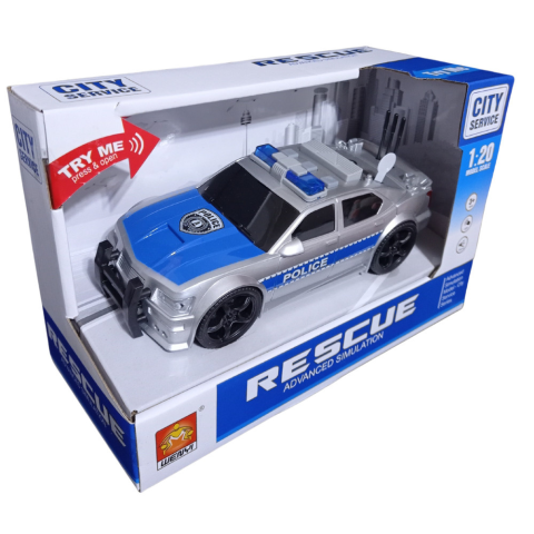 A rendőrautó kicsinyített mása. Három különböző hangszólamon szólal meg a gombok segítségével. Az autó hátulja nyitható. Mérete: 19x 8.5x 7.5 cm.