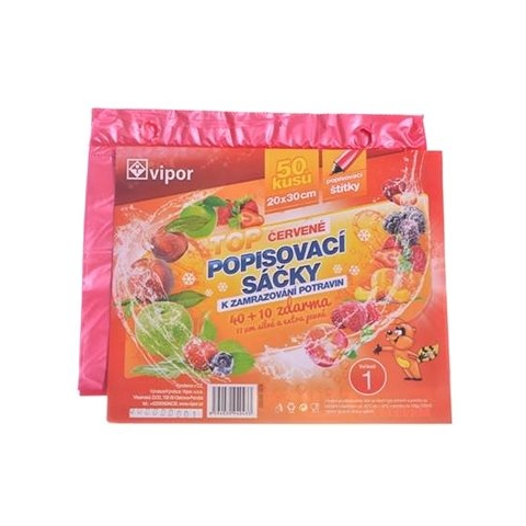 Fagyasztó zacskó - egyszer használatos kivitel, élelmiszer tárolására megfelelő, zár nélküli, anyaga mikrotén, méretei 30 × 20 cm (ma × szé), 50 darab a csomagban A praktikus Vipor zacskók élelmiszerek csomagolására és tárolására alkalmasak. A fagyasztózacskók szakadás- és vízállóak és leíró címkével vannak ellátva. Így a mélyhűtőben könnyen megkülönböztetheted