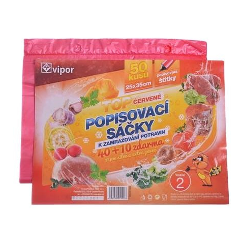Fagyasztó zacskó - egyszer használatos kivitel, élelmiszer tárolására megfelelő, zár nélküli, anyaga mikrotén, méretei 35 × 25 cm (ma × szé), 50 darab a csomagban A praktikus Vipor zacskók élelmiszerek csomagolására és tárolására alkalmasak. A fagyasztózacskók szakadás- és vízállóak és leíró címkével vannak ellátva. Így a mélyhűtőben könnyen megkülönböztetheted