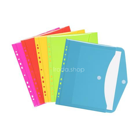 Irattartó tasak, A4, PP, patentos, VIQUEL Happy Fluo, vegyes Színes irattartó tasakok! -formátum: A4 -méret: 31,5 x 24 cm -patentos záródás -anyaga: fényes PP -vegyes színek, a szín nem választható (kék - zöld - sárga - piros - rózsaszín) Gyártó/els