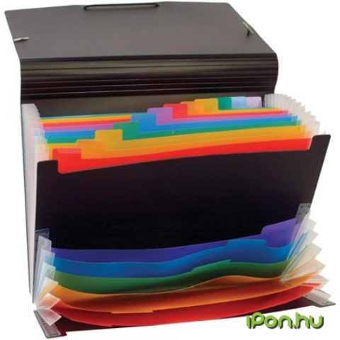- - A4 méretű dokumentumok tárolására- rugalmas, tartós, polipropilén alapanyag- gumiszalaggal záródik- regiszteres kivitel, feliratozható címkékkel- kívül fekete, belül különböző színű rekeszek- a 12+6 rekeszes változat, 12 db A4 és 6 db A4/2 méretű rekeszt tartalmaz