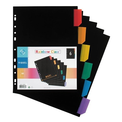 Regiszter, műanyag, A4 Maxi, 6 részes, VIQUEL "Rainbow Class", fekete - IV157067 - Műanyag elválasztólapok - lefűzött dokumentumok praktikus rendszerezéséhez fekete színű alap különböző színű fülek az egyszerű azonosításért 11 lefűzőlyuk méret: 230x310 mm