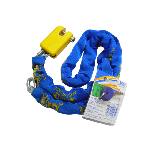 VIRO SUPER MORSO kerékpár zár, láncos, 120 cm lánchossz, 2db kulcs, 5db réz csap a zárban, 7 mm vastagságú mangánnal ötvözött edzett acél lánc, kék színű karcálló műanyag burkolattal