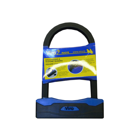 VIRO U-zár,motorkerékpárokhoz, egy darabból álló horganyzott acél zártest, négyzetes 16 mm átmérőjű. edzett, réz, nikkel és krómozott kétoldalt záródó acél kengyel, belső méret 19x10,5cm,2db Német ezüst kulcs, ABS burkolat, zár védő retesz