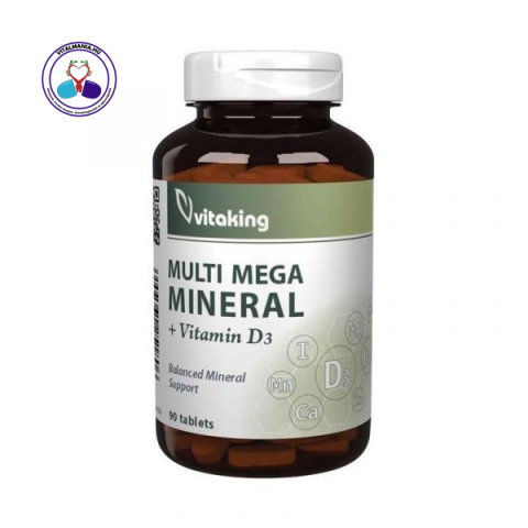 A Vitaking Multi Mega Mineral ásványi anyagokat, D-vitamint és egyéb aktív hatóanyagot tartalmazó étrend-kiegészítő. Nyomelemekből (cink, mangán, vas, réz, króm, molibdén) naponta mindössze néhány ezred vagy milliomod grammnyit használ fel a szervezetünk, ennek ellenére elengedhetetlenek egészségünk megtartásához. Ásványi anyagokból (kalcium, magnézium, kálium) nagyobb mennyiségre van szükségünk. Az ásványi anyagok és nyomelem