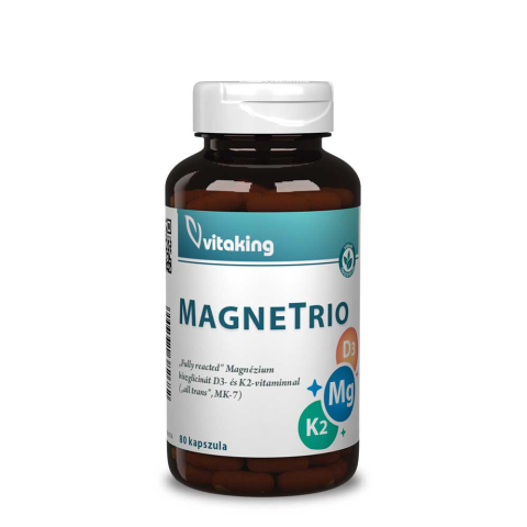 A Vitaking MagneTrio egyetlen kapszulában kiváló minőségben és nagy mennyiségben tartalmaz 3 létfontosságú tápanyagot. Mi van a termékben? Magnézium, D3-vitamin,és Menakinon-7 (MK7) a legjobban hasznosuló K-vitamin forma. Egyetlen kapszula 90 μg K2 vitami