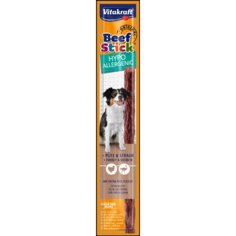 Vitakraft Beef Stick (hipoallergén) jutalomfalat - kistestű kutyák részére (12g)Vitakraft Beef Stick – Kiváló minőségű,vitamin dús, ízletes, húsos jutalomfalat - barázdák segítségével könnyen törhető és adagolható - tartósítószer mentes - színezék mentesösszetétele:Hús és állati melléktermékek 92,6% (ezekből 83,6% izomhús, pulyka 79,6%, strucc 4%)gabonafélék (rizs 2,3%)növényi melléktermékek (burgonyakeményítő 1,8%)zöldségek (burgonya, szárítot