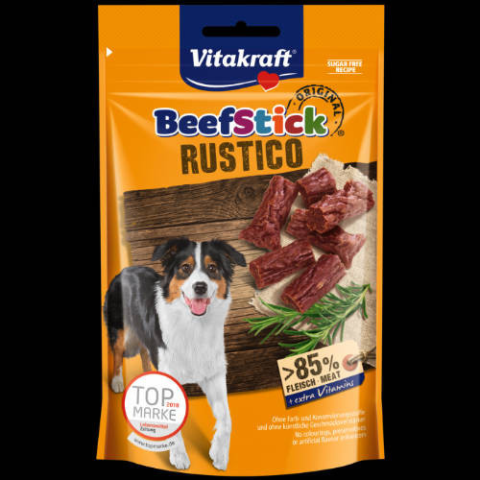 Vitakraft BeefStick Rustico - jutalomfalat (marha,szalámi) kistestű kutyák részére (55g)Különösen magas hústartalom,> 85%VitaminokkalCukormentes Színezék nélkülTartósítószerek nélkülMesterséges ízfokozók nélkülCsomag újrazárható