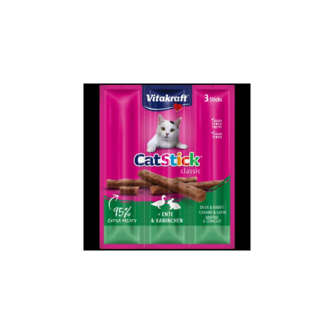 Vitakraft Cat Stick Mini - jutalomfalat (nyúl,kacsa) macskák részére (3x6g)Nyúllal és kacsávalExtra húsos (95%)Cukormentes receptGabonamentestökéletesen oszthatószínezék nélkülMesterséges ízfokozók nélkül3 adag egy készletben