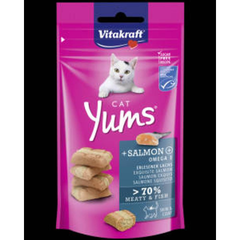 Vitakraft Cat Yums Snack - puha jutalomfalat (lazaccal) macskák részére (40g)Lédús macska snackek látható töltelékkelExtra húsos, finom lazacTermészetes omega 3-mal a bőr és a kabát számáraCukormentes receptÚjra zárható táskában
