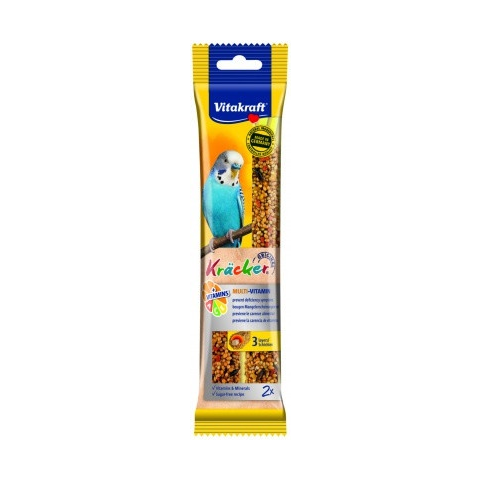 A Vitakraft Kracker dupla rúd egy vitaminokban és ásványi anyagokban gazdag csemege hullámos papagájoknak.Felhasználási útmutató: Legjobb, ha mindig van egy rúd a ketrecben.Összetétel: gabona, ásványi anyagok, növényi származékok, méz, gyümölcsök, olajok és zsírok, alga. Adalékanyagok/kg: A-vitamin 8.600NE, D3-vitamin 630NE, C-vitamin 400mg, E-vitamin 90mg. Színezéket és tartósítószert tartalmaz.