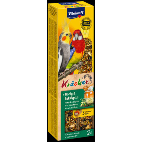 Kettős rétegű kracker, mézzel és eukaliptuszlevéllel a nagypapagájok rágcsálási igényeinek kielégítésére. Cukormentes receptúra, alapvető vitaminokkal és ásványi anyagokkal gazdagítva. A Vitakraft Kracker Dupla Rúd – Méz & Eukaliptusz egy prémium minős