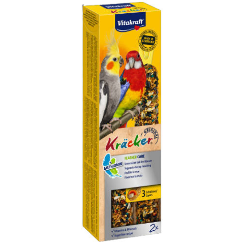 Vitakraft Kracker Dupla Rúd (tollváltó) – kiegészítő eleség nagypapagáj részére (180g)Alapvető vitaminok és ásványi anyagokCukormentes receptHárom finom rétegKiváló minőségű természetes alapanyagokPraktikus kliptartóval