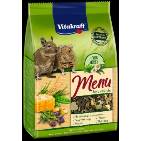 A Vitakraft Menu Degu, prémium teljes értékű eledelt, mely kifejezetten deguk számára lett kialakítva. Gazdag magokban, gyümölcsökben és zöldségekben. Ismerd meg a Vitakraft Menu Degu-t, a deguk számára készült teljes értékű táplálékot, mely gondosan ö